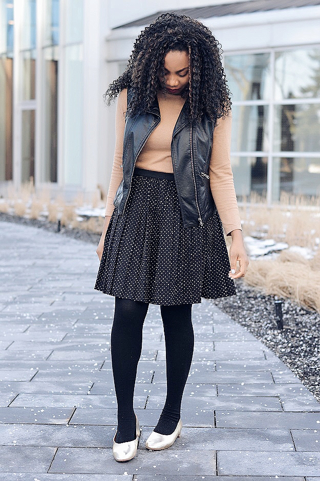 I bought it some years back at forever21 … I shop way too much at that store (covers face). I didn’t just want to wear a turtle neck top and this polka skirt. That would look nice but not as interesting with the addition of a leather vest. I always find ways to add a vest to any look. Call me vestaholic … wait what? lol, I just made that up. Anyway, hope you get my drift. I love how girly and fun this outfit turned out to be. What are your thoughts? Would you rock this look?