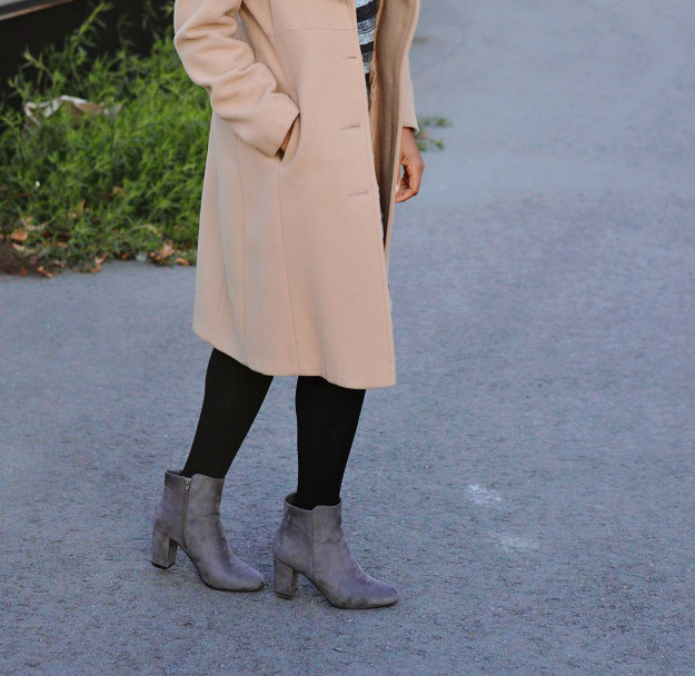 I took this outfit photos close to three weeks ago and just getting to sharing it now. Time has not been my greatest asset … lol. Grey, black and camel is such a beautiful combination that I gravitate to during the winter. Camel coat are so versatile you can wear them with absolutely everything. I have had this coat for three years now and still absolutely love it. I paired it with this stripe dress for an evening out with the Hubs.