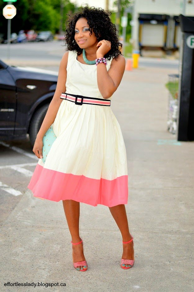 the pink at the hemline, the belt and it has somewhat of a vintage feel. I selected the