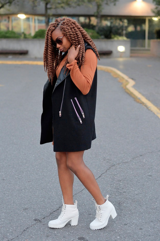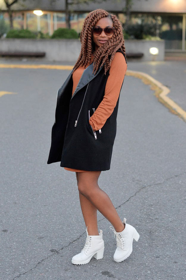 I wore this sleeveless jacket with this dress from “Forever 21” and boots from “Call It Spring”. Thoughts on this look?